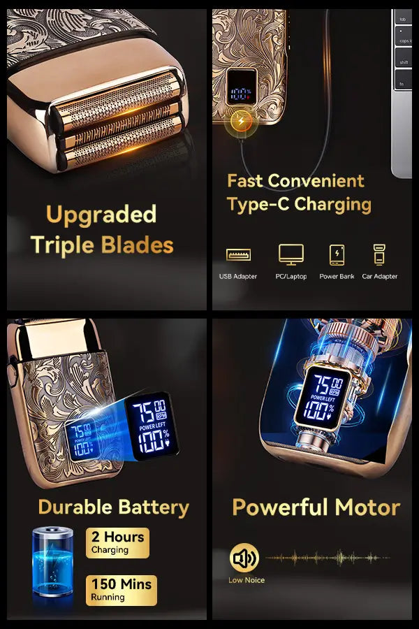The Ufree Professional Electric Foil Shaver for Men features a powerful 7500RPM motor and titanium-coated dual foil blades for smooth, precise, and irritation-free shaving. Designed with a durable zinc alloy body and three adjustable speed settings, it provides comfortable control for different beard types. The built-in 1000mAh lithium battery delivers up to 90 minutes of cordless use after a 2-hour charge, making it a reliable grooming tool for home use, travel, or professional barber supplies.