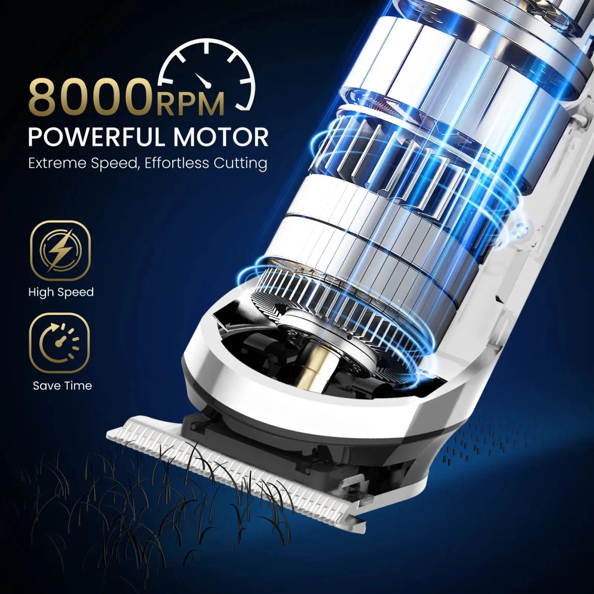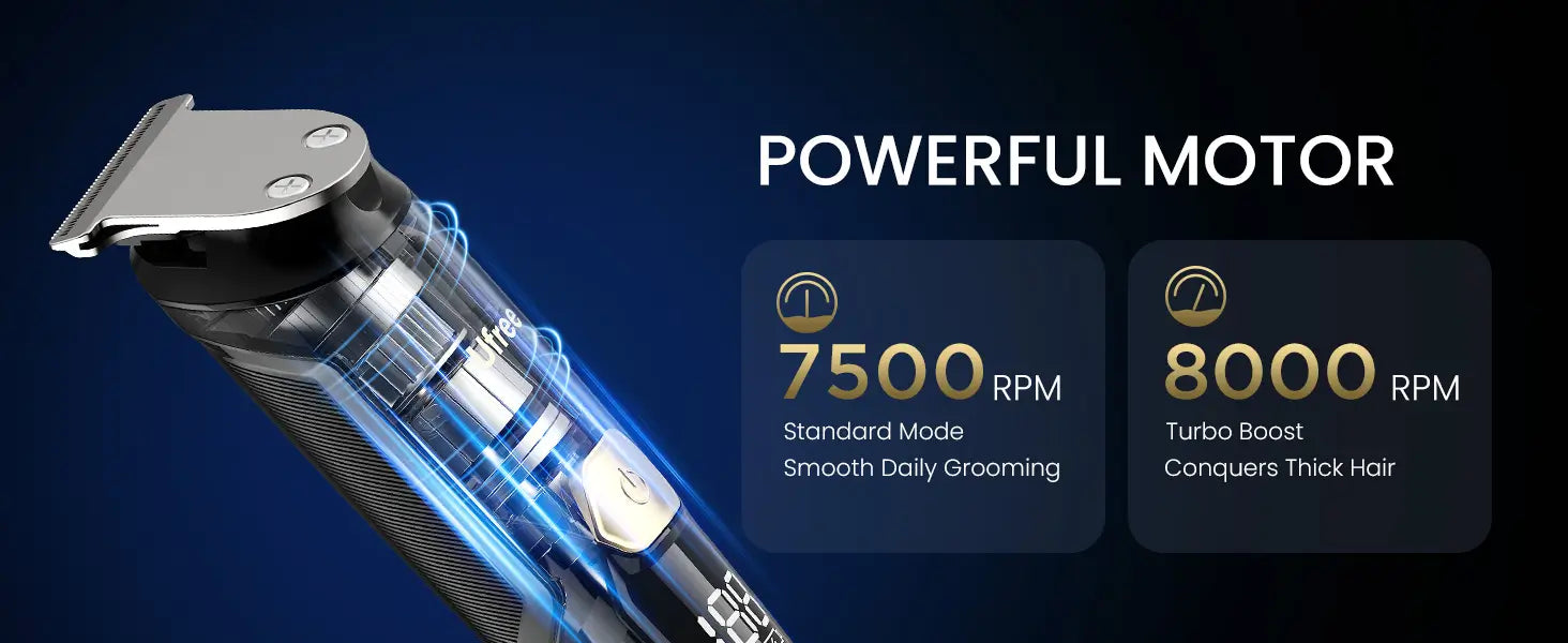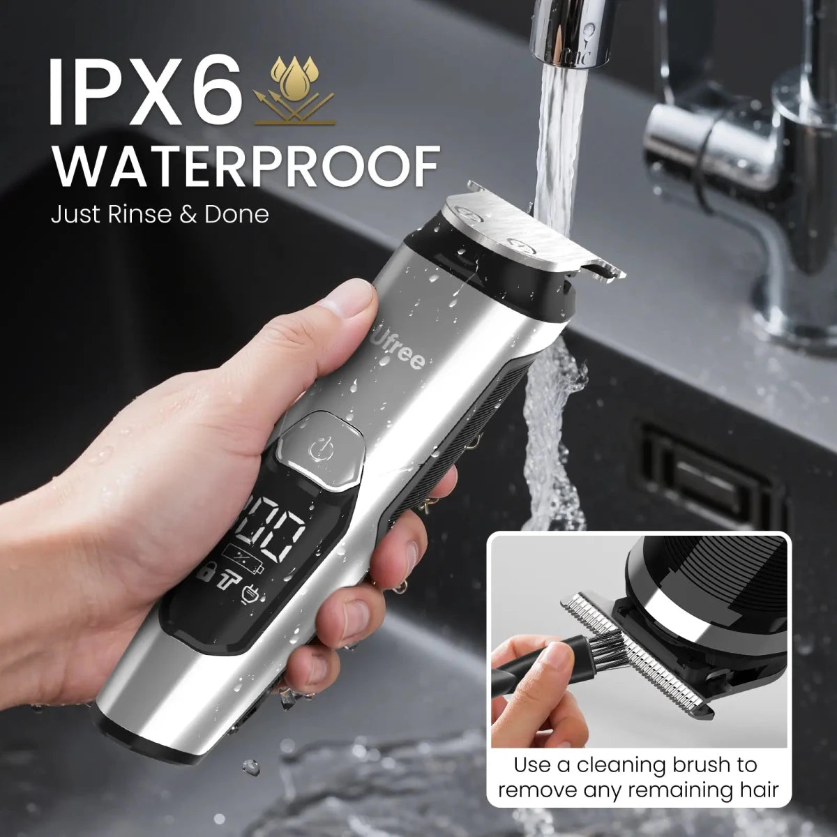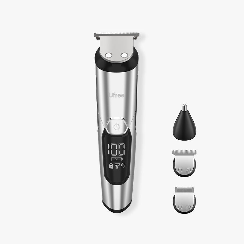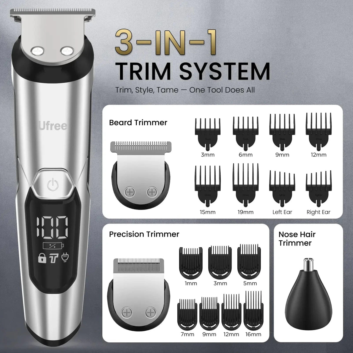 The Ufree 3-in-1 Beard Trimmer Grooming Kit features a powerful 8000RPM motor and precision stainless steel blades for smooth, efficient trimming of beard, sideburns, and nose hair. Designed with IPX6 waterproof protection, a smart LED display, and a touch-sensitive switch, it offers convenient control and durability. The rechargeable 800mAh battery provides up to 100 minutes of cordless use after a 1.5-hour charge, making it ideal for everyday grooming at home or while traveling.
