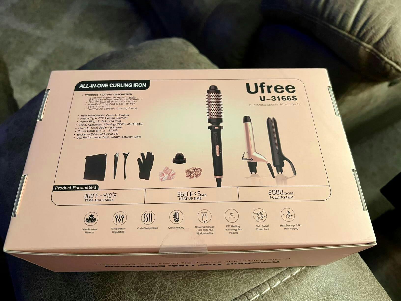 - Includes: 25mm curling iron with clamp, 38mm thermal brush, straightener, protective sleeve